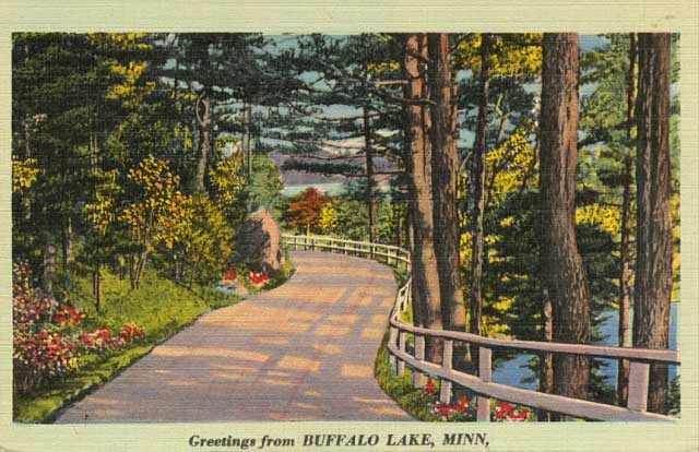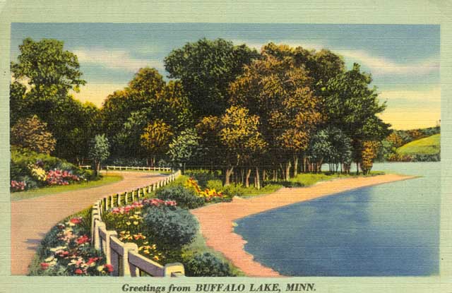 Instantly an image jumped out to me. A lovely postcard illustration of what Buffalo Lake, the actual lake, used to look like. The Minnesota Historical Society says that the postcard is from the 1940’s, but Buffalo Lake’s official website says that Renville County drained the 40-acre lake sometime in the 1920’s to provide more acreage for farmers.